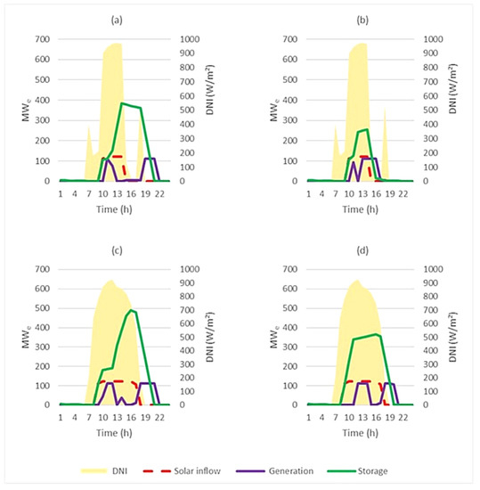 Operation of CSP plant 1 in the following scenarios: wet/night (a), wet/day (b), dry/night (c), and dry/day (d).