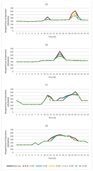 With respect to the marginal operating cost of the system, Figure 8 depicts the reduction achieved during the 24 h period for the typical days used in the simulations. In the wet/night scenario, the introduction of one CSP plant reduced the cost from 432.05 R$/MWh to 350.41 R$/MWh at 10:00 and adding two plants decreased the cost from 621.46 R$/MWh to 548.96 R$/MWh at 19:00. The cost declined to 470.34 R$/MWh with four CSP plants. In the wet/day scenario, the highest marginal operating cost reduction occurred during the period of the highest load, and the introduction of CSP plants reduced the cost from 621.46 R$/MWh to 548.96 R$/MWh, although at 14:00. In the dry/night scenario, the greatest reduction of this cost with the introduction of one CSP plant happened at 14:00 and 15:00, and the cost declined from 431.76 R$/MWh to 350.41 R$/MWh, and also at 19:00, with cost reduction from 621.46 R$/MWh to 548.96 R$/MWh. Finally, in the dry/day scenario, the greatest reduction occurred with the insertion of two CSP plants in the system, from 438.52 R$/MWh to 350.41 R$/MWh at 11:00 and from 438.52 R$/MWh to 376.80 R$/MWh at 19:00. In general, in the dry season scenarios, the impact of CSP plants on the marginal operating cost occurred more often in the day and the introduction of five CSP plants can reduce that cost by up to 26%.