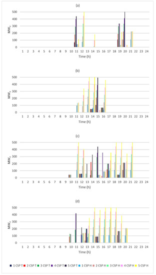 Step 5 consisted of simulating the electricity system with the introduction of the CSP plants, as presented in Section 3.2.4. Simulations were carried out with one, two, three, four, and five CSP plants in the system, determining the dispatch on an hourly basis of all the plants composing the system.