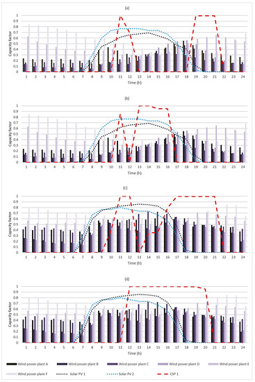 Capacity factor of wind farms, photovoltaic plants, and CSP 1 in the following scenarios: wet/night (a), wet/day (b), dry/night (c), and dry/day (d).