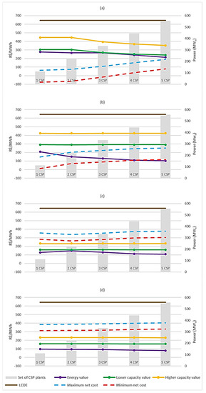 Table 8 presents the maximum and minimum net costs of each CSP plant added to the system in the scenarios with different sets of plants. The NCE of each plant increases with the inclusion of other plants, and the highest value obtained was 405.84 R$/MWh—the maximum NCE of CSP plants 2 and 4 with five CSP plants in operation in the dry/day scenario. Thus, the cost of a CSP plant, previously estimated by the LCOE at 644.64 R$/MWh, can be reduced by at least 37%.