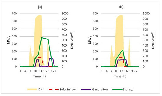 The 6 h TES system was modeled as a storage device whose capacity is equal to the useful capacity of the 6 h TES system, given by the difference between the maximum capacity of the TES and the minimum energy volume stored in the tanks necessary to prevent degradation of the storage fluid. The efficiency of the TES system, about 93% due to efficiency losses in the heat exchangers and long-term thermal losses [40], was represented by the storage device’s efficiency.
