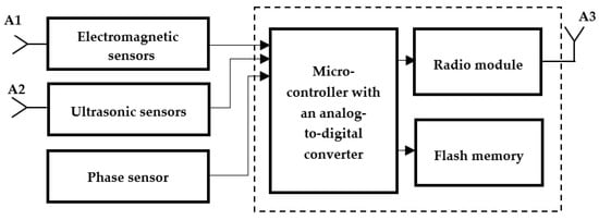 The layout of the measuring cell is as one shown in Figure 1. This measuring cell is equipped with electromagnetic and ultrasonic antennas with corresponding receivers. The communication module is connected via I2C, SPI, or UART/USART interfaces [39]. The communication module transmits the received data to the control room via a 2.4 GHz radio channel.
