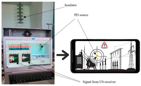 Figure 1 shows contactless mobile diagnostic devices that were used to detect PDs in high-voltage insulators (HVI). The diagnostic device conducts basic measurements using electromagnetic (EM) and ultrasonic (US) sensors [37] and a phase sensor. Diagnostic devices have been installed at the substation at a distance from the monitored HVI group. The ultrasonic sensor allows to localize a group of faulty HVIs and the EM sensor measures the electromagnetic field emitted by the PD using an antenna. This non-contact diagnostic device is used by the authors for inspection of insulators.
