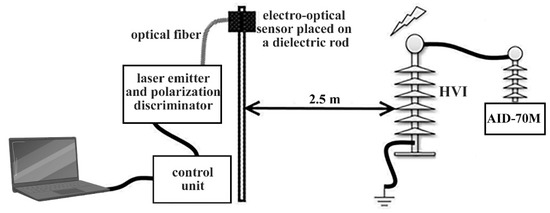 Figure 4 represents the flowchart of the developed device for non-contact remote diagnostics of HVI. The device consists of a series-connected laser emitter (1), a polarization discriminator (2), an optical fiber (3), a photodetector (5), a narrow-band amplifier and a comparator (6), a personal computer (or laptop) (7), and an electro-optical sensor (4) connected to a fiber light guide (3) and a photodetector (5) [42]. The main measuring element of the device is the electro-optical sensor (4), which can be placed directly in a high alternating electric field because it is made without the use of metal elements. The optical fiber is also protected from the electric field.