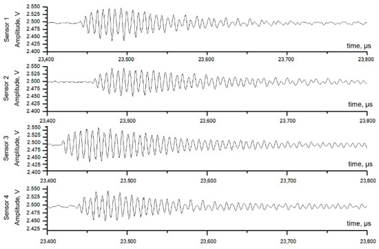 The microphone array consists of four piezoelectric receivers with a resonance frequency of 41 kHz. The entire microphone array is enclosed in a metal housing to minimize induced electromagnetic noise from high voltage equipment. Cross-correlation of sensor signals is used to localize an acoustic source using a microphone array [33,36]. Figure 7 shows the amplified signals at each receiver for the same PD.