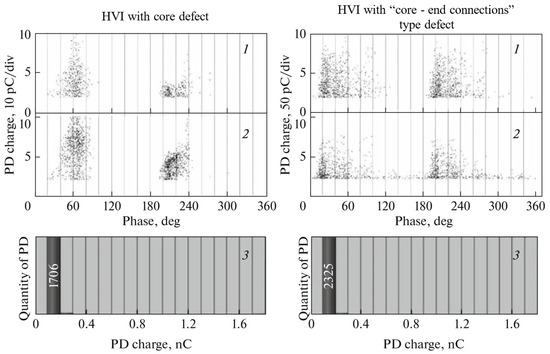 Examples of the obtained generalized characteristics of PDs and overvoltage are shown in Figure 11 and Table 1, which shows the parameters of the most intense PDs, which are about 10% of the total PD in each phase interval. Workable includes HVI No. 1–5, and inoperative—HVI No. 6–7. Between the groups, the phase shift of the radiation (∆φ) is 20–30%, the increase in intensity (q) reaches 2–3 times, and the amount of PD increases 2–3 times. Differences in the values of PD parameters for the registration period of 10 min did not exceed 2–3% for both sensors.