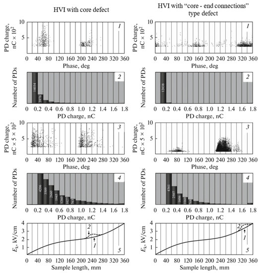 Parameters of PD and induced field gradients in polymer HVI, measured by electromagnetic and electro-optical sensors, respectively: 1, 2—small defects; 3, 4—large defects; and 5—spatial distribution of induced field gradients.