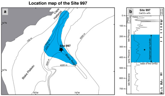 Site 997 was drilled at the Blake Ridge crest, a large contourite system [45] located in the North Atlantic U.S. margin (Figure 1). This site was selected to validate our numerical model results due to the availability of high-resolution pore water chemistry data, the presence of gas hydrate, and abundant methane of microbial origin [46]. Well-developed bottom simulating reflections (BSR) are recognized in seismic sections in the area and are interpreted as the result of free gas accumulation below the GHSZ [47]. The drilled deposits consist of Holocene to late Miocene, light gray and greenish gray, fine-grained (clay) sediment with abundant (up to 50 wt%) authigenic carbonate, which occurs as nodules and concentrated beds mostly between 50–100 m below seafloor (mbsf) and >500 mbsf (Figure 1). The occurrence of dispersed gas hydrate was reported between 180–450 mbsf, and a large piece (15 cm long) was recovered at 331 mbsf.