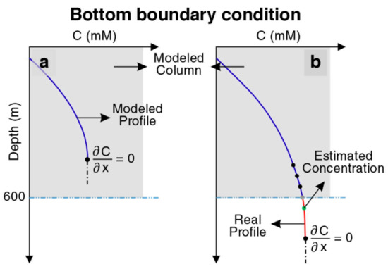 Graphics illustrating the approach to define bottom boundary conditions for methane, DIC, and free gas. (a) Zero concentration gradient is imposed before the first layer of the sediment reaches the bottom of the model at a depth of 600 m. (b) Extrapolating a virtual point after the first layer passes the bottom of the model.