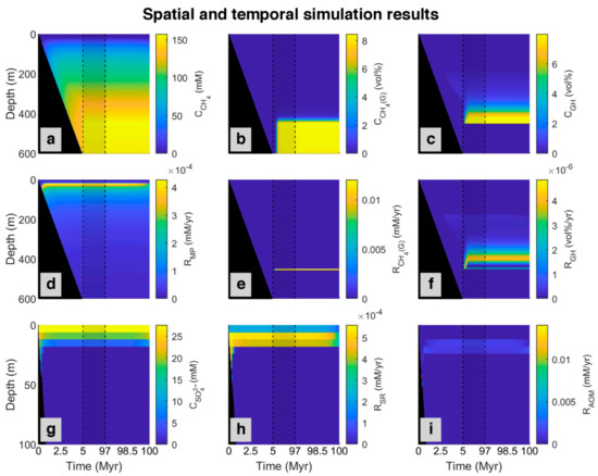 Spatial and temporal results of the model for the simulated ODP site 997 [49] magnified in the first 5 Myr and the last 3 Myr (plots without magnification are presented in Appendix A, Figure A1). First row: Concentration profile of (a) Dissolved methane (CH4); (b) Methane in the gas phase (CH4 (g)); (c) Methane in hydrate phase (GH). Second row: Simulated rates of (d) Methanogenesis (MP); (e) Free gas formation (CH4 (G)), and (f) Gas hydrate formation (GH). Last row presented in shorter depth (to magnify the rate changes, which occur only at the upper part of the model): (g) Concentration profile of sulfate (SO42−); simulated rate of (h) Sulfate reduction (SR), and (i) Anaerobic oxidation of methane (AOM). The black area refers to the place where no sedimentation occurred. The area limited by dashed lines represents changes from 5 to 97 Myr.
