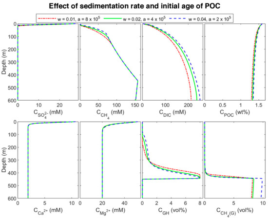 To find the effect of sedimentation rate in biogeochemical processes, site 997 with constant POC at the top of the column was modeled. Since a higher sedimentation rate is equivalent to younger organic matter age [6,9,15], we considered three different initial ages with a linear function of sedimentation rate. The three sets are: (a) = 0.01 cm/yr and = 8 × 105 yr (oldest), (b) = 0.02 cm/yr and = 4 × 105 yr (middle-aged), and (c) = 0.04 cm/yr and = 2 × 105 yr (youngest)). The results of the last time step of each set are plotted in Figure 6. By decreasing POC initial age (increasing the sedimentation rate), the organic matter becomes more reactive, and the POC degradation rate increases (according to the results, the rate of youngest POC is almost 3.73 and 1.93 times higher than the rate of the oldest and middle-aged one, respectively) results in increasing sulfate reduction and methanogenesis rates (Figure 7), and consequently, shallowing the SMT and increasing methane production (Figure 6). As methane generation increases, pore water is saturated at shallower depths, hydrate formation commences in shallower depths, and the thickness of hydrate (the supersaturation zone of methane) increases (276, 330, and 366 m for the oldest, middle-aged, and youngest, respectively), which is in general agreement with other studies [9,60]. Nevertheless, the gas hydrate average concentration decreases with an increase in sedimentation rate. Upward gas migration velocity in the lowest sedimentation rate is the highest; thus, more gas reaches GHSZ, and consequently, more hydrate is formed at the same time. On the other hand, the gas hydrate in the system with the lowest velocity is buried slower, and it leaves the GHSZ more slowly; therefore, it dissociates with a slower rate compared to the other two modeled systems. As a result, the amount of gas accumulated below the GHSZ is not proportional to the hydrate amount.
