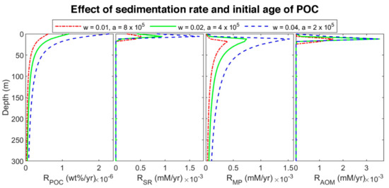 Rate profiles of modeled results at different sedimentation rates and initial ages of POC in the last time step of the model.