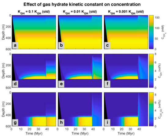 Simulated spatial and temporal concentration profile at different gas hydrate kinetic constant. First row: (a–c) Dissolved methane in pore water. Second row: (d–f) Methane hosted in gas hydrate phase. Last row: (g–i) Free gas.