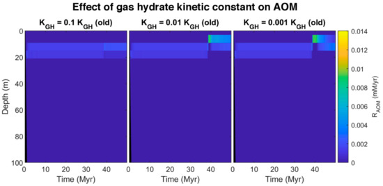 Here we propose an idea to explain the coexistence of free gas and gas hydrate in GHSZ from the kinetic perspective. The presence of materials in pore water and sediments with the ability to retard gas hydrate formation and suppress the gas hydrate growth can decline the gas hydrate formation rate (such as polysaccharides [61,62] and polyvinylcaprolactam [63] as natural and artificial kinetic hydrate inhibitors, respectively). To investigate the effect of gas hydrate formation kinetic in pores, after about 37 million years, we assumed the kinetic constant of gas hydrate decreases to 0.1, 0.01, and 0.001 of the initial value. The model was run for over 50 million years. By reducing kinetic constant, the rate of hydrate formation decreases, and since the sedimentation rate is constant, hydrate dissociates faster compared to the formation, so the pore volume occupied by gas hydrate diminishes, and the excess (supersaturation) of methane is released as bubbles (see time 38 Myr in time-lapse video in Video S2). On the other hand, as shown in Figure 8, by decreasing the gas hydrate kinetic constant, free gas below the GHSZ can migrate upwards to shallower depths. According to the model, free gas in GHSZ causes pore water to be saturated at shallower depths, increasing gas hydrate thickness and shallowing the SMT. Although the rate of AOM increases (Figure 9), it is not enough to consume all the methane, and some part of free gas can vent out the seafloor. The efficiency of AOM barrier is 97.75, 38.78, and 28.22% for the gas hydrate kinetic constants of 0.1, 0.01, and 0.001 KGH, respectively. This indicates that, by increasing the amount of free gas in top layers, AOM cannot consume all methane and leads to methane efflux to the sea-water interface. There is indication that dissolved organic carbon [64] and potentially some kinetic inhibitors may be concentrated in the sediments over time. As a suggestion, we recommend to investigate the existence of the kinetic gas hydrate inhibitors in future expeditions, especially at areas with seafloor methane venting.