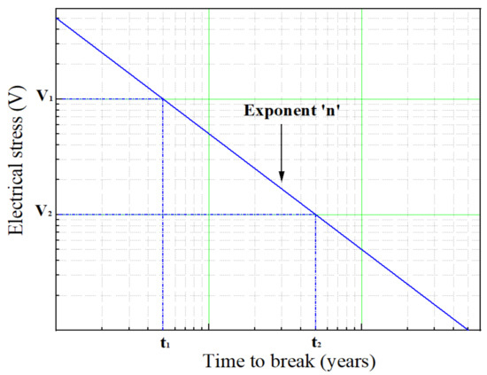 Insulating materials for power cables are exposed to various stresses. As the operating time of the cable increases, aging progresses and the insulation performance degrade. V-t test is an experimental method based on electrical stress of aging factors. As a result, the life exponent n and the formula of life estimation due to electrical stress can be calculated, and it is mainly used in the long-term reliability evaluation method. The equation of V-t is as follows [23,24].
