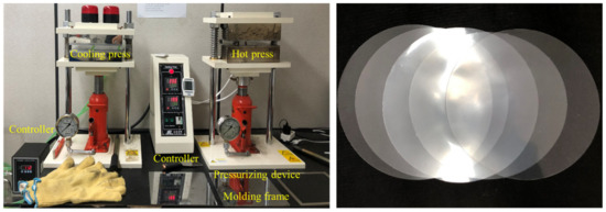 Prior to sheet production, the hot press was heated to 200 °C for 5 min. Then, compound supplied by the cable manufacture was added to the molding flask, and the mixture was pressurized at 10 MPa for 5 min, and rapidly cooled for 2 min using a cooling press of 10 °C. Figure 2 shows the equipment for manufacturing the PP sheets and the completed test sample.
