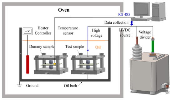 Figure 4 shows the schematic representation of ramping and the V-t characteristic test. An oven was used to maintain a constant temperature of 110 °C for the test sample, and a temperature sensor was constructed to the dummy sample, and the temperature of the PPs was measured in real time. The transformer oil was put into an oil bath made of stainless steel to prevent flashover, and the oil bath was grounded. For the supporting structure of the breakdown test a polytetrafluoroethylene (PTFE) that was not deformed even at a temperature of 110 °C or higher was applied. A heat-resistant silicon-insulated cable was used to apply DC voltage in the air and oil inside the oven.