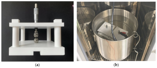The pictures of V-t test: (a) electrode with micrometer and PTFE structure; (b) dummy sample inside oil for measuring temperature.