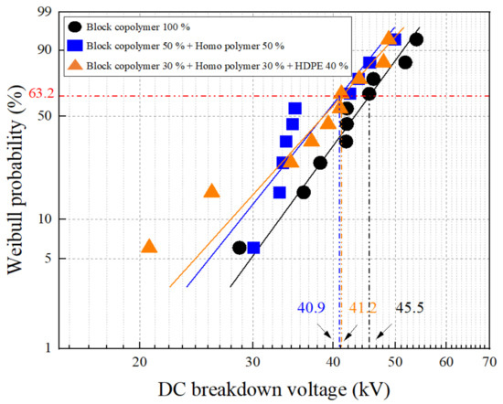 In this study, dummy samples were used to measure temperature in real time, and a commercially available micrometer was used to present a method for a constant measuring force of samples. The V-t characteristics test of the test samples was conducted at 110 °C. As shown in Figure 7, Figure 8 and Figure 9, the life exponent according to the breakdown voltage and time to breakdown is quantitatively calculated. The block copolymer had a value of 20.1, the case block copolymer and homo polymer were mixed, with a value of 21.1, and the block copolymer, homo polymer and HDPE were mixed, with a value of 23.2. We compared the electrical performance between the materials mixed block copolymer, homo polymer and HDPE to prove the long-term reliability and applicability of HVDC. In addition, we evaluated the electrical performance which is the cable design life of 40 years. The electrical performance of the insulation mixed block copolymer, homo polymer and HDPE is up to 17% higher than block copolymer. Additionally, it was found that the mixed material without HDPE was also about 16% higher than the block copolymer, and the influence of HDPE seems to be inadequate. However, HDPE has a corrosion resistance to water, which will prevent the aging and failure due to moisture penetration of the submarine and underground cable and will ensure long-term reliability. Based on this study, evaluation of electrical performance with PPs when exposed to water is also essential, and further research on the long-term reliability of the block copolymer and HDPE mixed materials are not mentioned in this paper.