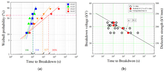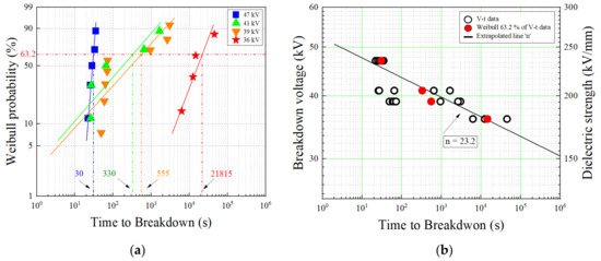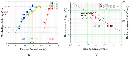 In Figure 7a, Figure 8a and Figure 9a the analyses are shown of the breakdown data using the Weibull distribution function, and Figure 7b, Figure 8b and Figure 9b display the figure for calculating the life exponent and life estimation equation. In Figure 7b, Figure 8b and Figure 9b, the red data is the Weibull 63.2% of the breakdown time according to the applied voltage, and the life estimation was derived from the four red data. In the figure, the fastest breakdown data in Figure 9 was 23 s when 47 kV was applied, and the longest lasting data in Figure 8 was 87,138 s when the voltage 36 kV was applied.