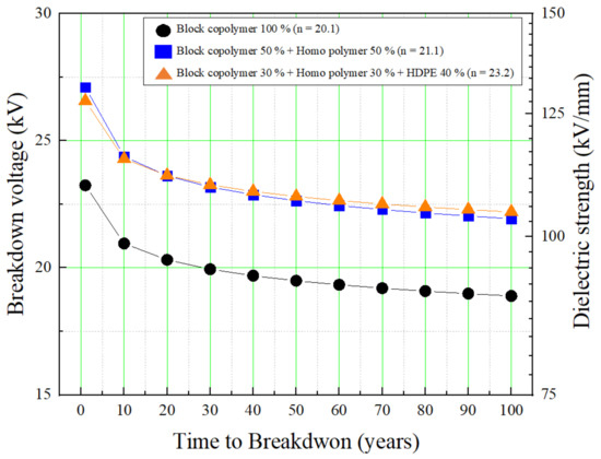 Since the design life of a power cable is usually 40 years, an equation that can calculate the long-term operating life due to electrical stress was needed. Table 3 shows the life exponent and life estimation formula of other PPs with the mixing ratio of additives.