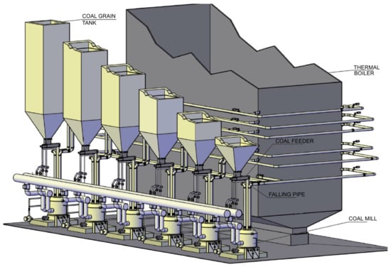 The basic process in a coal-based thermal plant, beyond the production of electrical power, is the transformation of chemical energy embodied in coal-to-thermal energy that is then transformed into mechanical energy used to spin the turbine. The mentioned ability of energy transformation is a result of coal combustion inside a thermal boiler. However, in order to achieve the required heat generation, coal combustion should be carried out under appropriate and time-constant conditions. Thus, the requested quantity and quality of coal powder entering the furnace of the boiler is provided by six coal mills, specifically positioned at certain locations of the boiler, as presented in Figure 1. Each component of such a complex system should be in perfect operating condition to guarantee proper operation during the extensive time of exploitation. At the same time, the continued degradation of essential elements in the system could disrupt its functionality and cause breakdowns. During exploitation, we found that several critical faults responsible for production breakdown are often caused by components that are a part of the coal mill subsystem. Because of the complex nature of the power plant and the countless faults that could potentially cause plant breakdown, we optimized maintenance actions and costs by determining two crucial components, i.e., the coal feeder and falling pipe of the coal mill subsystem that are responsible for most faults. It is important to note that in the current maintenance strategy, any fault reported on one of these two components of the coal mill causes the automatic unavailability of the power plant. Frequent power outages, in addition to losses caused by undelivered electrical power to the distribution network, are also causing additional costs due to the complex and lengthy process of restarting the electricity production.