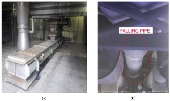 The raw coal is transported from the grain tank using the coal feeder, onto the falling pipe and then enters inside the coal mill where the coal particles are mixed with air and transferred into the furnace. The coal feeder, shown in Figure 2a, consists of a belt conveyor driven by an AC motor with controllable rotational speed and various sensors. Its capacity is from 6 to 15 t/h. The falling pipe, shown in Figure 2b, is a 6.5 m-long pipe that is shielded with another wall where hot air flows. This structure facilitates the continuous transportation of coal without clogging caused by variation in the moisture level of raw coal.