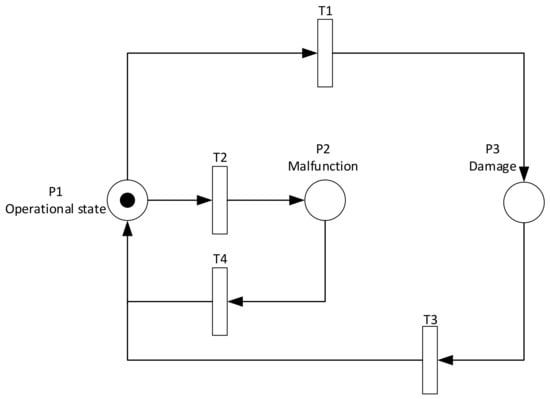 With the described concept of PN, it is possible to examine a sequence of events without any knowledge about time. Thus, the authors in [38] presented the stochastic Petri nets where transitions are related with time-driven probabilistic models. In [39], a complex system with multi-unit configuration is modeled by generalized stochastic Petri nets (GSPN) where the time to failure of degraded components follows a Weibull distribution.