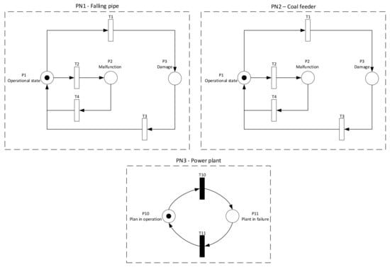 By combining two basic components, where the first GSPN describes a falling pipe (PN1), and the second GSPN describes a coal feeder (PN2), we propose a simulation model of the coal mill (presented in Figure 4). The purpose of the model was to evaluate the hypothesis that, by introducing a remediation-based maintenance strategy, the effectiveness of the whole system can be improved. Therefore, the status of the coal mill in the aforementioned model is described through a simple Petri net (PN3). The PN contains two states, i.e., P10 indicates whether the coal mill is operating properly, and P11 indicates a failure of its components. Immediate transitions T10 and T11 are triggered by falling pipe and coal feeder Petri nets in cases when any kind of failure happens or a component is repaired.