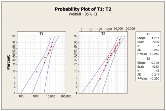 Coal mill feeder T1 time to failure (left) and T2 time to damage (right) represented by Weibull probabilistic distributions, where red dots are empirical data obtained for each event; N is the number of obtained data; AD is the value of Anderson–Darling statistical test; and the p-value is a measure of how well the data follow the obtained Weibull distribution.
