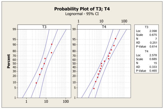 Figure 6 graphically represents the goodness of fit of the coal feeder repair periods that are estimated by lognormal distributions for each event, where the variable Loc describes the mean of the natural algorithm and the variable Scale indicates the standard deviation according to Equation (3). For instance, it can be seen that for time to repair from failure (T3), the parameters of the lognormal distribution are equal to and . According to Anderson–Darling test, the data of both events follow the calculated distributions with the significance level of 5%.