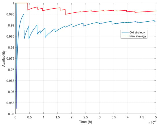 Figure 8 shows the availability of the simulated model, which is another important measurement of the system’s performance. As can been seen, the availability value of the proposed remediation-based maintenance is higher than the availability value of the old strategy during the entire period of simulation. After a year (8760 h) in operation, the availability of coal mills, when the new strategy is applied, is equal to of the availability when the old maintenance strategy is applied—while during the same period, the availability of coal mills, when the proposed remediation-based maintenance is used, is equal to . It can also be noticed that a minimal availability value for the old strategy () is much lower than the minimal availability value of the new strategy ().