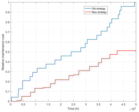 Finally, Figure 9 shows the maintenance costs of the coal mill obtained in the performed simulations. In order to emphasize the relative difference between the costs of two different strategies, the maintenance costs were scaled to values in the range from 0 to 1. We defined the cost of each maintenance action, i.e., the cost of failure and the cost of damage. The cost of failure includes the cost that reflects the time required to repair a certain component plus the cost incurred due to unrealized revenue. On the other hand, for the damage of a component, the repair cost is equal to the cost of the material consumed and the time spent during repair works. For the falling pipe, a failure repair cost is equal to 0.83, while the damage repair cost is equal to 0.17. Furthermore, failure and damage repair costs of the coal feeder are equal to 0.89 and 0.11, respectively. As can been seen in the plots, after the first year (8760 h) of operation, the cost of the old strategy is equal to 0.29, while the cost of the new strategy is equal to 0.09. Therefore, the proposed remediation strategy reduced the maintenance cost by after one year of operation. After the second year of operation, the savings in maintenance costs are equal to , while at the end of the simulation, the cost savings are .