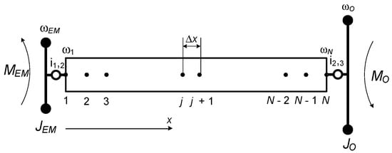 The following additional terms are introduced in Figure 3: j—current discretisation node of shaft equations, ωj—angular velocity of the jth discrete node, Δx—discretisation step, x—current coordinate, N—number of long shaft discretisation nodes.