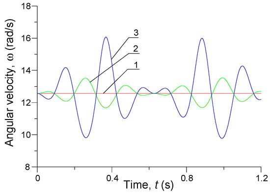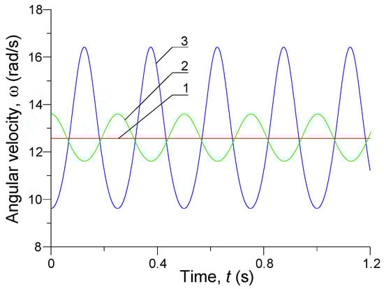 Angular velocity waveforms of three shafts: 1—first, 2—second, 3—third for the angles α1,2 ≠ α2,3 variable in time.