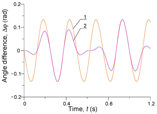 Waveforms of rotation angle differences between the first and third shafts for the angles α1,2 and α2,3 constant and variable in time: 1—the angles constant in time α1,2 ≠ α2,3 and 2—the angles variable in time α(t)1,2 ≠ α(t)2,3.