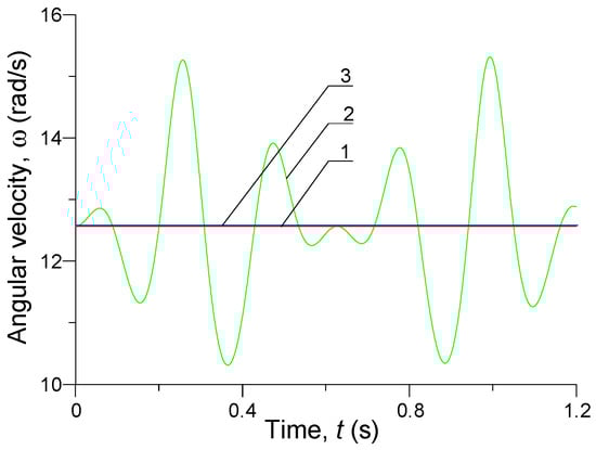 Angular velocity waveforms of three shafts: 1—first, 2—second, 3—third for the angles α1,2 ≠ α2,3 constant in time.