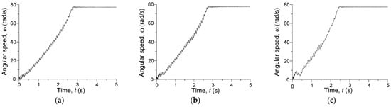 Angular velocity of motor rotor versus time for the shaft diameter D = 0.1 m and three angles between the adjacent shafts: (a) α1,2 = α2,3 = 0; (b) α1,2 = α2,3 = π/8; (c) α1,2 = α2,3 = π/5.