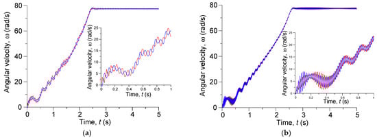 The system is in the operating zone prior to resonance and in a resonant state. Figure 9 illustrates angular velocity waveforms as a function of time for two shafts: the rotor of the asynchronous motor (red) and input shaft of the loading mechanism (blue) for two cases. The first case applies to D = 0.1 m—Figure 9a. The other case holds for the following parameters: D = 0.192 m—Figure 9b. Both the figures clearly show that velocities of both the shafts are identical in the steady state. In transient states, on the other hand, when oscillatory processes are present across the shaft, the velocities are different. It is clear that for the smaller shaft diameter, the velocity oscillations are in counter-phase; see Figure 9a. In Figure 9b, the system is resonant. It is impossible, as for dual-mass systems, to distinguish a priori a specific resonant frequency. The zone of resonance can be defined here.