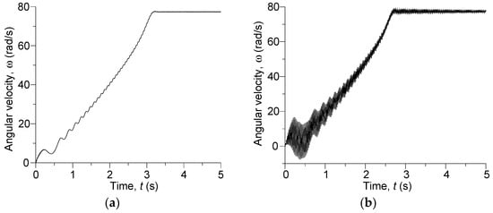Angular velocity of motor rotor versus time for α1,2 = α2,3 = π/5 and shaft diameter: (a) D = 0.3 m; (b) D = 0.1825 m.