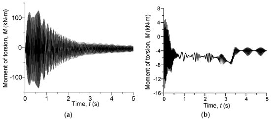 In Figure 11a, D = 0.1825 m and α1,2 = α2,3 = π/5. In Figure 11b, D = 0.3 m and α1,2 = π/8 sin(5t), α2,3 = π/4 sin(5t). The system in Figure 11a is in the resonant zone, and that in Figure 11b is out of the resonant zone. If the torque of drive loading is 4 kNm, the amplitude of moments of torsion in resonance reaches even 140 kNm—Figure 11b. Where the drive is in the steady state, on the other hand, the amplitude is approximately 14 kNm. In the resonant state, the electric drive obviously cannot operate properly.