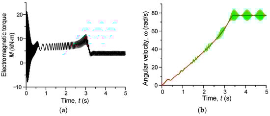 The speed ratio values cause electromagnetic torque oscillations not only in the transient state but also the steady state, since the drive loading torque rises periodically. Figure 12b contains graphs for two shafts: asynchronous motor rotor (red) and left end of the middle shaft (green) with the following parameters: D = 0.3 m, α1,2 = π/8 sin(5t), α2,3 = π/4 sin(5t). The system is in its normal operating condition, i.e., out of resonance. The time-variable cardan joint speed ratio causes an oscillatory rumble in the middle shaft. In this case, the drive motor in the steady state rotates with a constant rotational speed.
