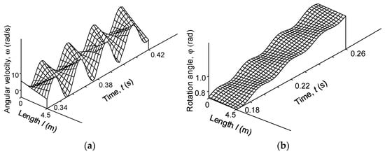 In Figure 14a, D = 0.1825 m, α1,2 = α2,3 = π/5. In Figure 14b, D = 0.3 m, α1,2 = α2,3 = π/5. Analysis of the 3D graphs clearly shows the highly complicated processes in the middle susceptible shaft with distributed mechanical parameters. The angular velocities and rotation angles of the shaft’s spatial discretisation nodes change in line with the laws of physics. The moment of torsion as a function of the coordinate x changes according to the value of the cardan joint speed ratio. Mechanical waves in reducer-free systems are known to lead to a virtually identical moment of torsion across shafts [,].
