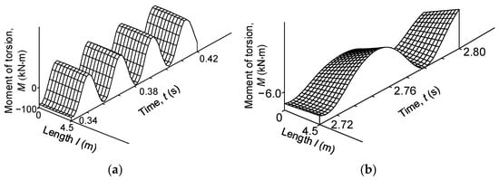 Spatial–temporal waveforms of moment of torsion across the shaft for: (a) t (0.34; 0.42) D = 0.1825 m α1,2 = α2,3 = π/5; (b) t (2.72; 2.80): D = 0.3 m α1,2 = α2,3 = π/5.