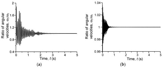 Angular velocity of two shafts versus time for the α1,2 = α2,3 = π/5 and shaft diameter: (a) D = 0.1 m; (b) D = 0.192 m.