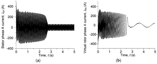 Current waveforms for D = 0.1825 m, α1,2 = α2,3 = π/5 and: (a) stator phase A current; (b) rotor’s virtual A phase currents.
