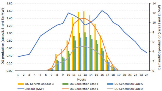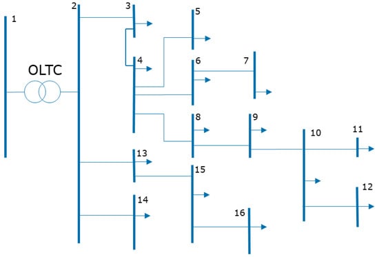 Figure 1, was used to assess the proposed method. This distribution power system is made of 16 buses and 18 lines. The daily energy demand is 218.83 MWh, the average hourly consumption is 9.12 MWh, and the peak-demand (at hour 16) is 12.52 MW. Since it is an urban feeder, the DGs are located at buses 6, 9 and 11.