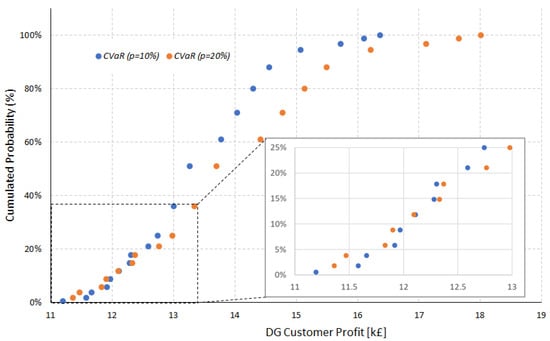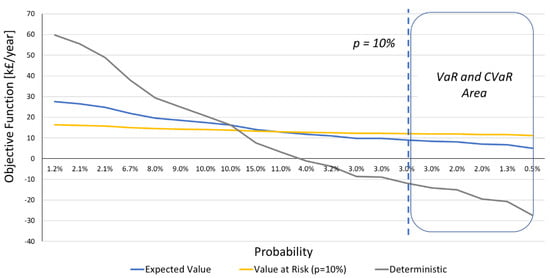 The slope of the curves is the measurement of the uncertainty that the customer can face in the long-run. When the risk is not considered explicitly (deterministic model), the benefit can be 60 k£/year in the best case or −27 k£/year in the worst case. Using the