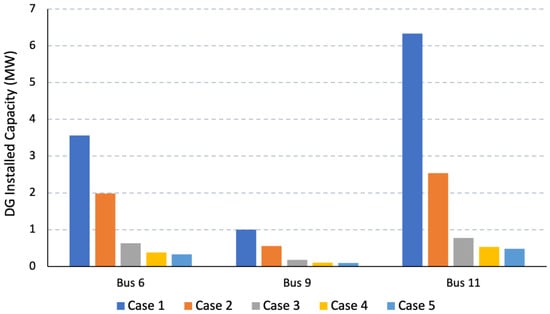 Figure 6 shows the size of the DG installed (MW) depending at each bus (6, 9, or 11) and the price paid for the energy injected to the network (Expected Value of each case: 1–5). Obviously, the highest power installed in each bus is obtained in case 1 (high EV). Bus 11 is the best location to install the highest number of DGs.